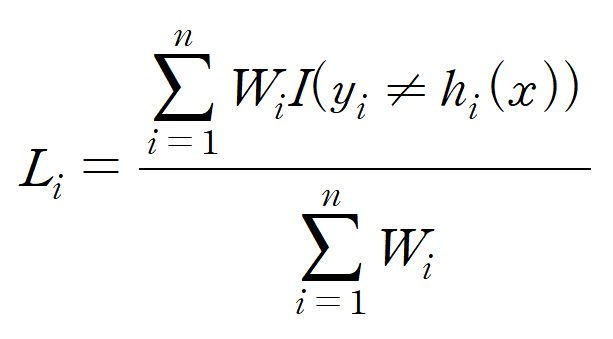 오분류된 세모 관측치 3개의 가중치를 업데이트하는 것이 다음 과정입니다. 기존 가중치였던 0.1과는 달라야 다음으로 구축된 학습 모델에서 오분류된 관측치에 대한 학습을 달리 할 수 있습니다. 가중치에 대한 손실함수와 학습기의 가중치를 통해 오분류된 관측치의 가중치를 구할 수 있습니다.