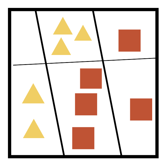 다음 관측치의 가중치는 모두 0.1로 설정되어 있으며 세모 5개, 네모 5개로 구성된 관측치입니다. 처음 구축된 학습 모델이 다음과 같이 분류되었다고 가정하면 10개의 관측치 중 3개의 관측치가 오분류된 것을 알 수 있습니다.