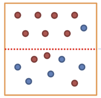 만약 위의 예시를 다음과 같이 분할한다면 분할 후에 특정 영역에 속하는 데이터의 비율을 구해 새로운 엔트로피를 구할 수 있습니다. 새로운 엔트로피가 분할 전의 엔트로피보다 작음을 알 수 있습니다. 이를 통해 의사결정나무 모델은 분할 기준에 따라 가지를 쳐서 전체 데이터를 부분 집합화하는 것이 불확실성을 낮추고 분류 성능을 높일 수 있다는 것을 알 수 있습니다.
