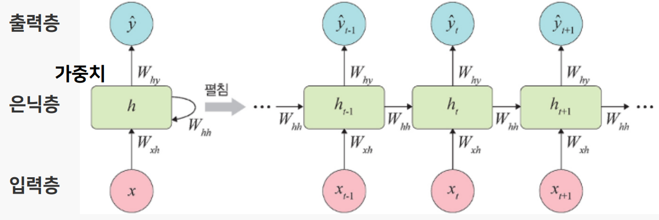 현재 시점의 은닉층은 입력층의 정보와 이전 시점 은닉층의 상태가 합성된 정보를 출력층으로 전달합니다. 펼쳐진 구조를 확인해 보면 이전 시점 은닉층의 상태가 누적되면서 현재 시점까지 전달되고 목표 시점의 출력층까지 반영되는 것을 알 수 있습니다. 현재 시점 은닉층에 이전 시점 은닉층의 상태를 합성하는 것은 이전 시점 은닉층에 가중치 Whh을 곱하는 것입니다.