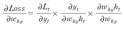 가중치에 대한 업데이트는 다른 딥러닝 신경망 모델과 마찬가지로 경사하강법을 이용하여 Loss 값을 최소화하는 것입니다. 다만 언급된 3가지의 가중치는 어느 시점의 영향을 받는지를 고려해야 합니다. 첫 번째로 업데이트 과정을 알아볼 Why는 정보를 은닉층에서 출력층으로 전달할 때만 사용되므로 하나의 시점에만 영향을 받습니다.