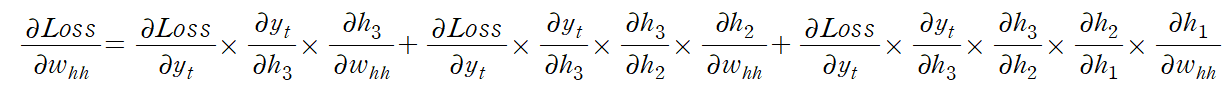 Whh와 Wxh는 여러 시점에 포함되므로 각 시점마다 영향을 받는 Gradient 값을 포함해서 업데이트를 해줘야 합니다. 예를 들어, 시점 3까지의 영향을 받는 Gradient 값을 구하기 위해서는 시점 3의 영향, 시점 3,2의 영향, 시점 3과 2,1의 영향을 함께 고려해야 합니다.