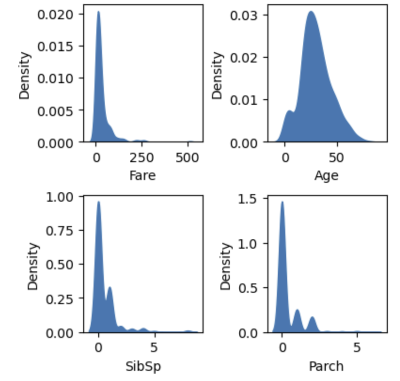 Fare, Age, SibSp, Parch에 대한 분포를 kdeplot을 통해 확인함으로써 데이터가 Scaling이 필요한지 확인할 수 있습니다.