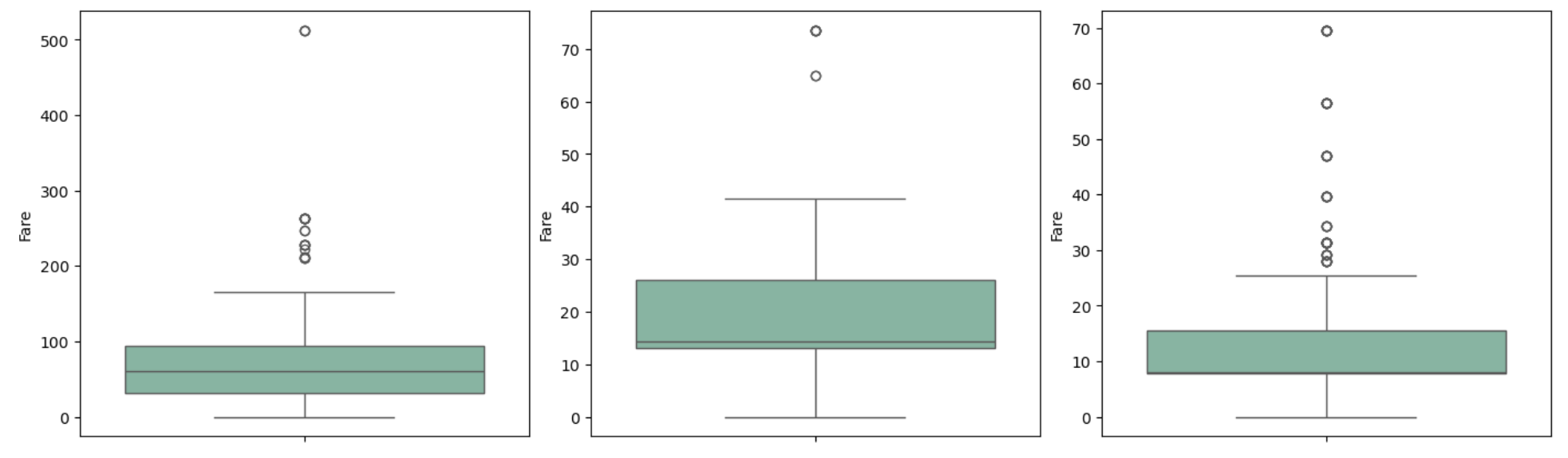 Pclass에 따라 Fare의 분포를 boxplot을 이용해 시각화하여 등급별 Fare가 얼마나 차이가 나는지 알 수 있습니다.