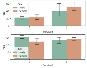 - Fare는 생존한 인원이 사망한 인원보다 더 높습니다. 사망한 인원은 성별에 무관하게 Fare 차이가 거의 나지 않지만, 생존한 인원은 여성의 Fare가 남성의 Fare보다 크다는 것을 알 수 있습니다.