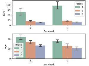 seaborn의 barplot을 이용해 카테고리 별로 Age와 Fare의 추이를 확인할 수 있습니다.