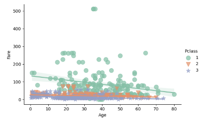 Sex, Pclass, 생존 여부에 따른 Age와 Fare 간의 관계를 lmplot을 통해 확인하여 상관관계가 존재하는지 확인할 수 있습니다.