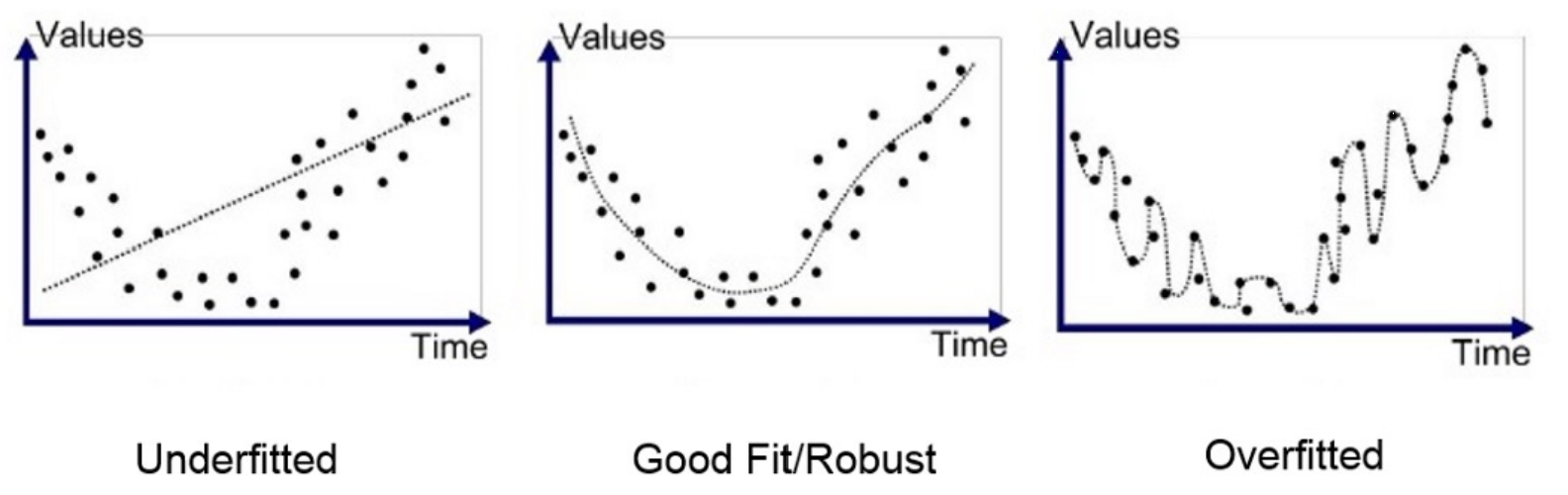 먼저 Underfitting에 대해 알아보겠습니다. Underfitting에 대해 한 문장으로 표현하자면, 데이터 복잡도에 비해 모델 복잡도가 떨어져 학습 정확도가 매우 낮다라는 것입니다. 여기서 복잡도는 표현하는 정도라고 이해하시면 좋습니다. 즉 우리가 구현한 모델의 표현하는 정도가 데이터가 표현하는 정도를 따라가지 못해 데이터의 패턴을 모델이 제대로 학습하지 못하여 정확도가 매우 낮다는 것입니다. 위 그림에서와 같이 복잡도가 낮은 일차방정식의 모델이 data를 표현하기에는 큰 어려움이 있다는 것을 알 수 있습니다. 이를 방지하기 위해서는 data의 양을 증가시키거나 학습 반복 횟수를 늘리는 것입니다.