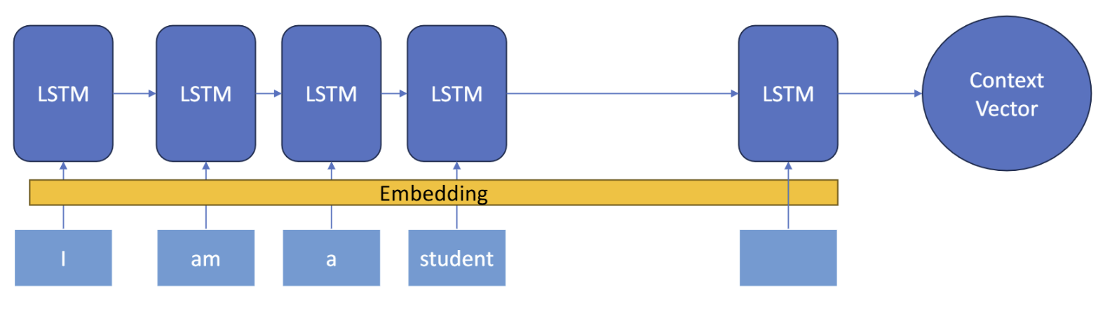 Encoder의 역할은 임베딩 벡터를 입력 받고 LSTM을 활용하여 고정된 크기의 Context Vector로 학습 정보를 압축시키는 것입니다. RNN을 활용할 수 있지만 LSTM은 자신의 Hidden State와 Cell State을 이용해 장기 의존성을 해결할 수 있습니다. 따라서 RNN 기반의 Seq2Seq보다 LSMT을 기반으로 Seq2Seq을 구현합니다