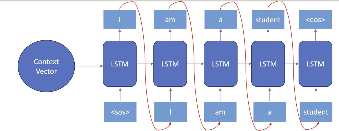 입력 시퀀스에 대해서 Encoder가 학습을 하면 Context Vector에는 학습 내용이 압축되어 산출됩니다. 그럼 Decoder은 이 Context Vector을 기반으로 번역 결과를 추론합니다.