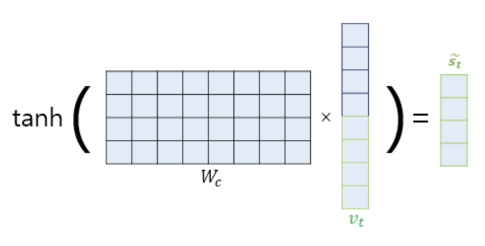 최종적으로 tanh 연산을 통해 Decoder의 다음 시점의 Hidden state의 입력값이 되는 새로운 벡터를 계산합니다.
