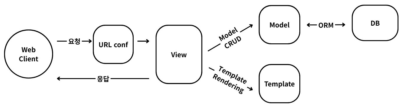 View는 웹 요청을 받아서 데이터베이스 접속 등 해당 애플리케이션의 로직에 맞는 처리를 하고 그 결과 데이터를 HTML로 변환하기 위해 템플릿 처리를 한 후 최종 HTML로 된 응답 데이터를 웹 클라이언트로 변환합니다.