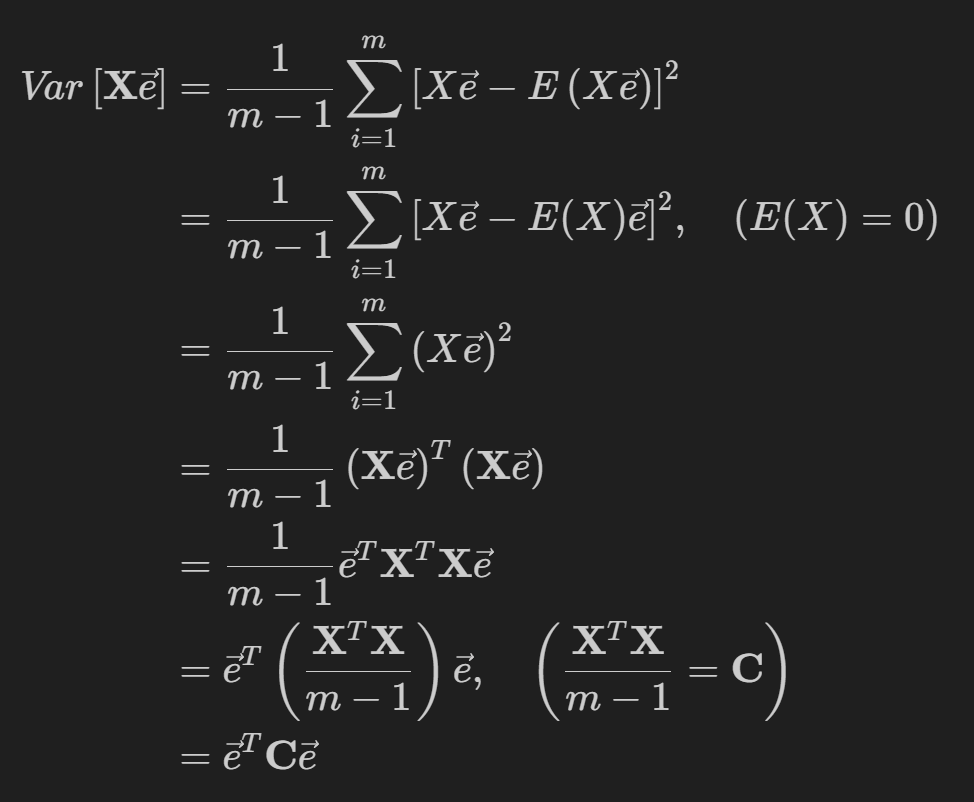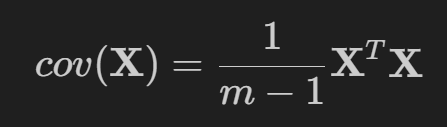n개의 Feature와 m개의 관측치를 가진 데이터의 공분산은 다음과 같습니다. 이를 통해, 데이터의 분산이 최대가 되는 축을 찾아 데이터셋을 임의의 단위벡터로 새로운 축에 투영시킬 수 있습니다.